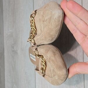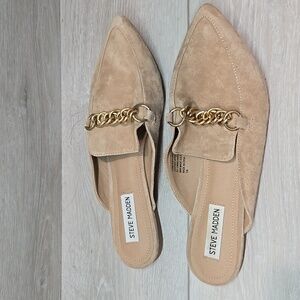 Step out in style with these Steve Madden loafers. Crafted in a chic tan suede, they feature a striking gold chain detail. Perfect for adding a touch of elegance to any outfit.