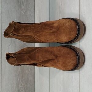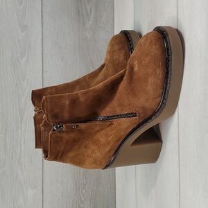 The MOBY ankle boot features a suede upper with a decorative exterior zipper set on a comfortable platform block heel.