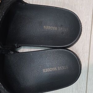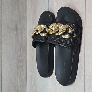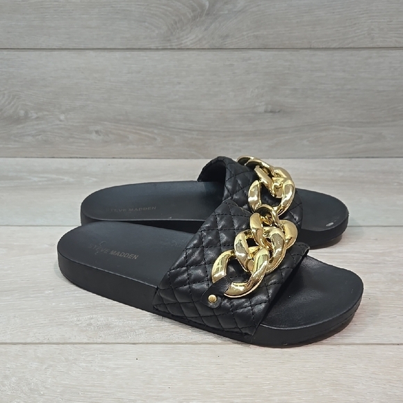 Steve Madden Women Zoray Black Quilted Slides with Gold Chain Sandals Sz 9