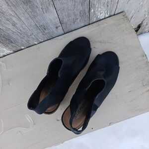 It's a black leather open toe style of ankle boots. It has light signs of wear. It's in good pre-owned condition Size 7.5