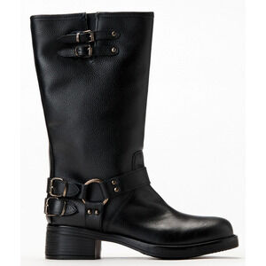 Designed with a square toe and block heel, these slip-on engineer boots feature a slouchy mid-calf silhouette, harness strap detailing, and dual buckle accents for a tough yet versatile look.