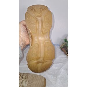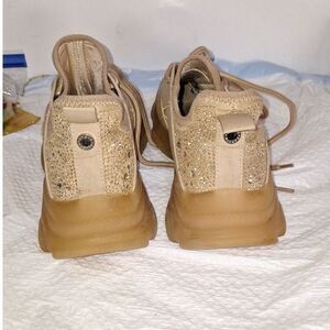 If you like your Athletic walking shoes with a bit of bling- check out this pair of Steve Maddens. They have rhinestones on the side panels and back of the foot. Over the toe area looks like a nylon mesh, and the chunky rubber soles have some good texture to prevent slipping. The inner sole is nicely padded as well. There is some wear on the bottom soless and inside the shoe, but these are in very nice pre-owned condition.