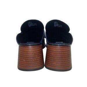 Stylish black loafer mules with chain detail, block heel, PU upper, and fabric lining. Modern and versatile design with sturdy construction. Size 11M.