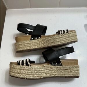 Details: 2.5 in platform. Real calf hair zebra print. Leather and straw/ jute. Adjustable straps.