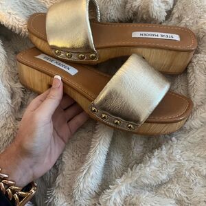 metallic gold, leather sandals, wooden heel, slip-on, summer footwear, minimalist, trendy, chic, vacation shoes, open-toe
