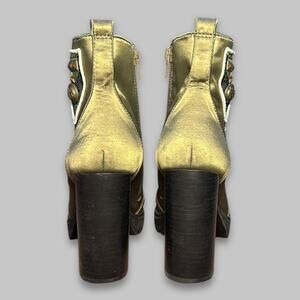 Note: These Laurie women’s gold satin lace-up boots feature a bold, statement-making design with military-inspired embroidery and a sturdy block heel. Perfect for pairing with jeans, dresses, or edgy streetwear looks. Colors may vary slightly due to lighting.