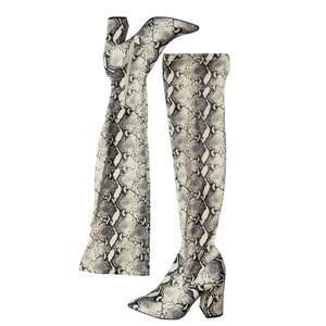Steve Madden's Jacoby Thigh High Over The Knee Boots in Snake Pattern. Super Tall Python Snake Print Boots with Chunky Block Heel and Pointed Toe. Black, White, and Gray Python Snakeskin Print. Excellent Condition, Gently Worn. Sexy Chic Going Out Boots. Casual or Formal. Super Comfortable