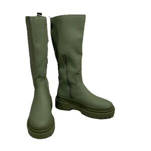 The Steve Madden Women's Macall Fashion Boot in Olive, size 9, is a stylish knee-high boot with a round toe and pull-on closure. Made with a waterproof synthetic upper and textile lining, this boot is perfect for travel and casual occasions in winter, fall, and spring. It features a zipper accent and a rubber outsole for added durability and comfort. The Macall boot by Steve Madden is designed with a medium calf width and a platform height of 2 inches, making it a versatile and fashionable addition to any woman's shoe collection.