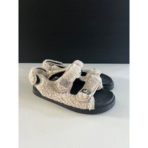 Manmade, polyester faux-fur or boucle fabric uppers; manmade lining; manmade sole