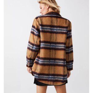 This Steve Madden shacket features a striking plaid design, offering a blend of style and warmth. The button-up front and long sleeves make it versatile for layering in cool weather. Its plush texture provides comfort, while the elongated fit adds a modern touch to any outfit.