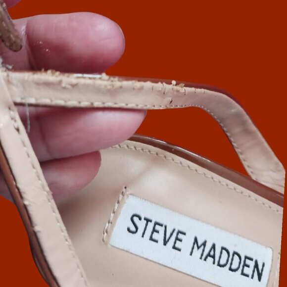 These Steve Madden sandals offer a chic and timeless design, featuring a patent leather finish and a comfortable platform heel. The ankle strap ensures a secure fit, making them an ideal choice for both casual and formal settings. Their nude color allows for versatile styling with various outfits.They are in good condition,without box they are just a little peeled on the inside of the straps as I show in the photos.from smoke and pet free home