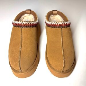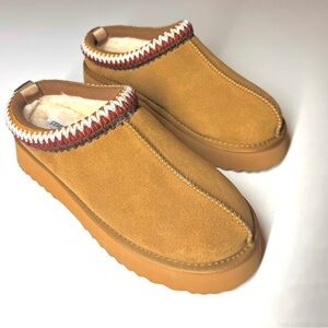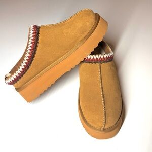 Stylish tan suede slip-on shoes featuring a cozy interior and multicolor trim. Perfect for casual wear.