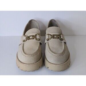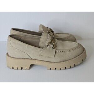 The Steve Madden Women's Size 8.5 Lyanna Suede Platform Loafers in Sand Suede are a stylish and versatile choice for various occasions such as travel, casual outings, or business meetings. These slip-on loafers feature a round toe shape, a lugged platform accent, and a leather outsole for durability. The beige suede fabric and leather lining make them comfortable to wear during any season, while the metal, city, or 90s-themed design adds a trendy touch to the overall look. Perfect for adding a touch of sophistication to any outfit, these Steve Madden loafers are a must-have for the modern woman.