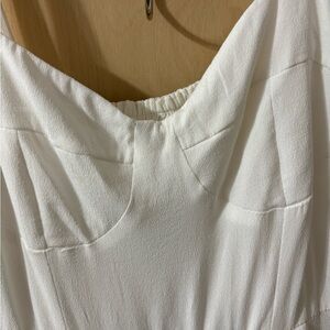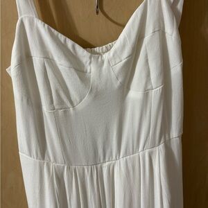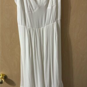 This gorgeous dress is midi length with a ruffled hem and has gauzy fabric (100% viscose), is fully lined (100% polyester), back smocking and shoulder tie closures, Also has a flattering bustier bodice,