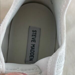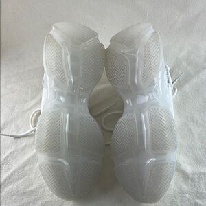 Step up your style with these sleek white athletic sneakers with rhinestones. Translucent bottom.