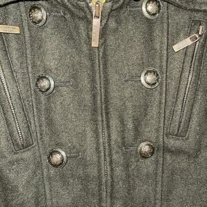 Steve Madden women's wool blend military coat in a vibrant green hue. This jacket is a size large but fits more medium see dimensions.
