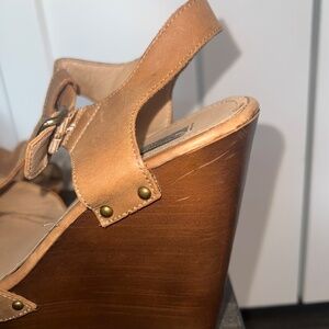 about 5" heel; 1.5" platform; peep toe; ankle buckle; leather