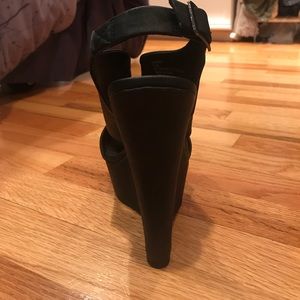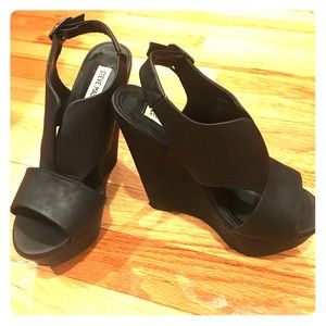 Adorable Steve Madden Xander wedges in black! These are great to wear out for a night at the bars, a special occasion, or more! Adjustable sling back with an awesome platform to make your feet more comfortable. Only worn a few times, there is a small scuff mark on the front of the left shoe.