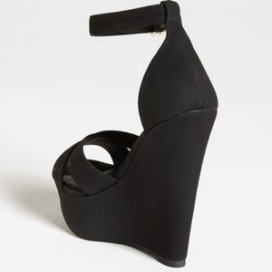 Black ankle strap wedges by Steve Madden. 5 inches high. Size 8. Worn twice only indoors so in great condition! SUPER flattering and sexy on!