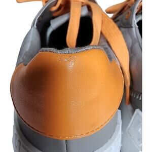 Grey camo sneakers with orange laces.