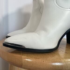 Steve Madden Zora White Leather Pointed-Toe Ankle Booties - Size 10 - Great pre-owned condition with some light scrapes and scuff marks on toe and side of boots, see photos for details