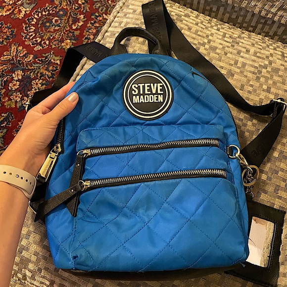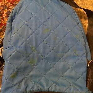 Steve Madden blue backpack with stains on it overall in good condition and I washed it myself but the yellow stains didn’t come out. It’s such a gorgeous back pack.