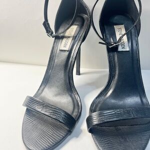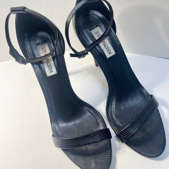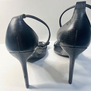 2 slender straps secure the sandal to its stiletto. high heel sandal. Almond toe stiletto sandal Ankle strap with buckle closure 4 inch heel height Leather upper material