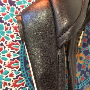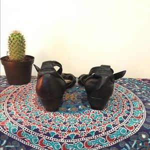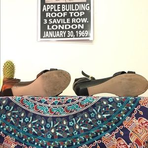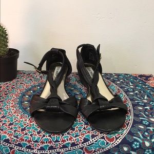 These black leather Steve Madden wedges have about a 1 1/2 inch wedge. They have only been worn once and are in great condition. There are a few little dents in the heel, which are shown in the pictures, but they really are not noticeable. These would probably be better for someone with average to larger sized ankles. I have very thin ankles and had to poke another hole in the strap to fit mine (in pictures), but it made them a little awkward to wear because of the larger sizing of the shoe.