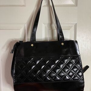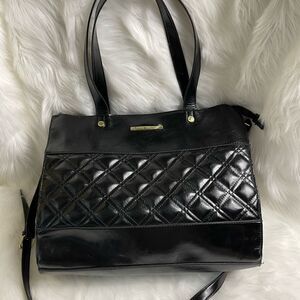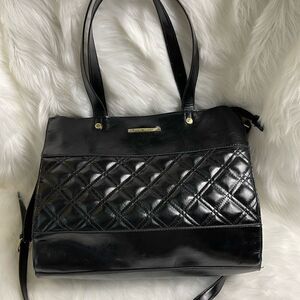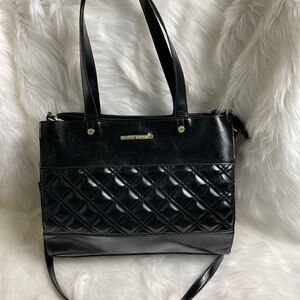 Steve Madden black quilted faux leather large shoulder bag with gold tone accents and hardwares top zipper with two side pockets a snap closure compartment with a detachable make up bag gently used see all pictures any questions please message Z1