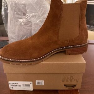 Brand new, never worn women’s Leopold ankle boot by Steve Madden. Classic chelsea boot, round toe, easy slip on style with a pull tab in super on trend brown (chestnut) suede leather.
