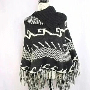 Steve Madden chunky knit Aztec style high/button neck fringe poncho sweater cape