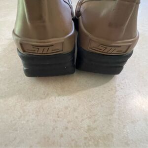 Women’s Steve Madden SM retro Bair Vintage style rubber rain shoes. Size 6.5. tan color. Preowned. Has minor signs of wear and spots.