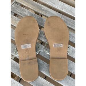 in very good pre-owned condition. strappy sandals with clear stones across the tops, tan footbed.