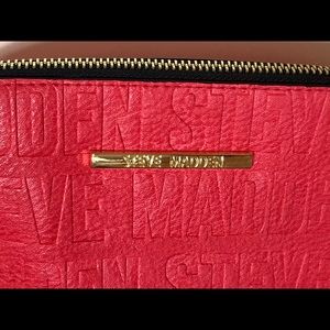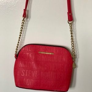 Bright coral crossbody Steve Madden purse. Gold tone zipper and chain. The purse is in good condition. Only been used a few times. Just updated to show small area at very bottom where there is a tiny blemish. Not noticeable unless looking very closely. Purse has an Inside pocket.