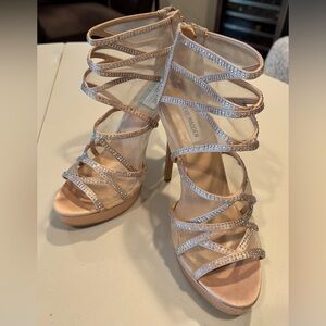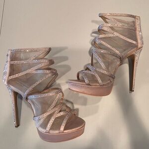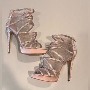 Women’s Steve Madden, Dinora, caged, bejeweled stiletto high heels. Zippered back closure. Mesh insets. There are a few rhinestones missing but they’re so small it is unnoticeable. Never worn. Purchased for $89.95, on sale. Tag is still on. Beautiful light gold, champagne color.