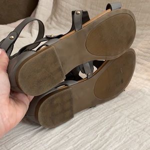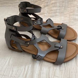 Gray leather sandals by Steve Madden. In great condition. Metal Studs . zippers work great on backs of shoes ! really cute
