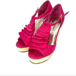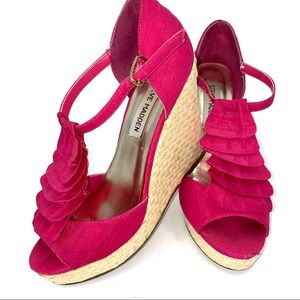 Steve Madden straight out of sex and the city and Carrie Bradshaw‘s closet🌺🌺 These dainty pink shoes “ A bit lighter then in the photos” floral wedges have a Ruffled Front with a 4 inch heel and an ankle strap🌺Should you have any questions please don’t hesitate to reach out🌺🌺