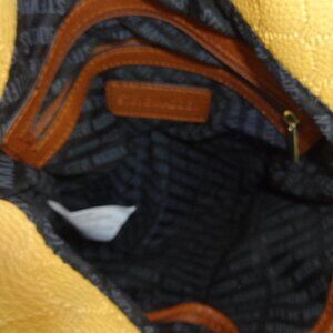 Steve Madden purse, mustard yellow, brown straps, gold tone hardware, 10x11