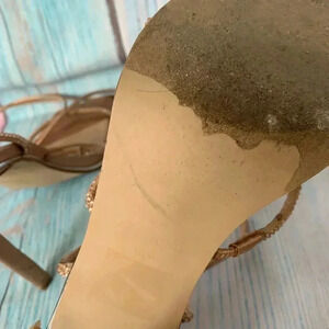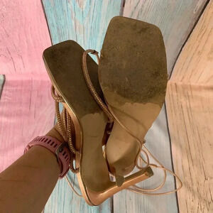 Steve Madden rose gold rhinestone strappy stiletto sandals. Size 8.5. In good pre owned condition. Super cute heel! Straps wraps around the ankle/leg.