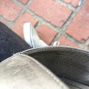 Silver platform peep toe heels. Satin fabric. The heel is patterned metallic. Ankle strap. 1¾" platform, 5" heel. Worn once. Great for formal event and anything more dressed-up