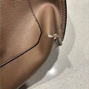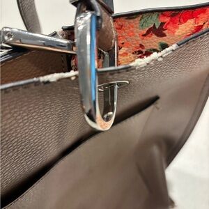 -Exterior bag is a brown/tan color with a pink floral interior. Apprx measurements: 16” wide and 10” tall. There is a little bit of wear around the front buckles and on the corners, please see photos. There is an internal pocket.