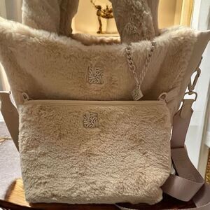 Furry tote bag with furry pouch that's not attached to tote bag.