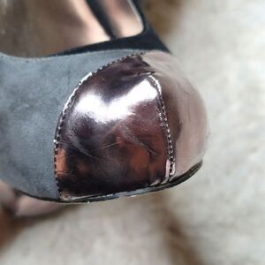 These adorable Steve Madden faux suede heels feature a gray, black, and a bronze/gold Colorblock patterning!
