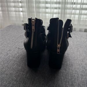Almond toe. Open ankle cutouts. Rear zip. Chunky block heel. Moto bohemian western casual modern minimalist edgy urban neutral chic trendy versatile ankle boots.
