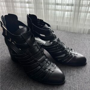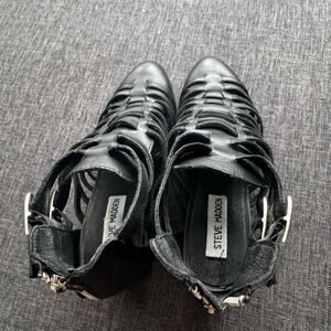 Genuine leather upper in black. Multiple strap design and adjustable ankle straps.