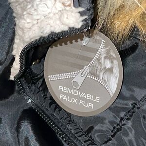 Attached hood with removable faux-fur trim; front zipper closure with snap button overlay