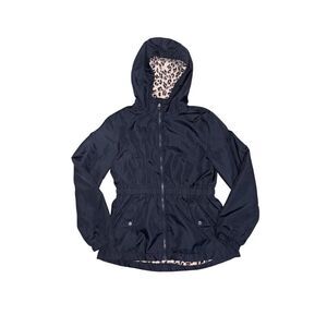 Black hooded jacket with inner animal print. Fill zip closure. Side pockets with flap and snap closure. Long sleeve with elastic cuff. Elastic waistband. 100% polyester. Size: medium 10/12. Preowned in good condition.