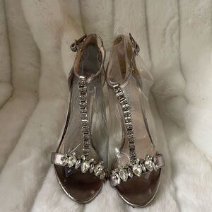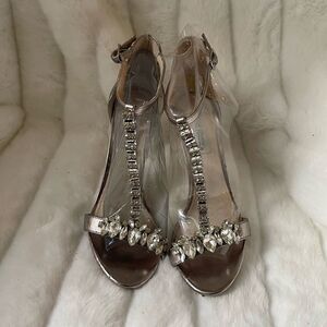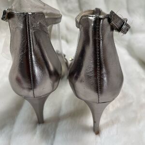 Steve Madden Shawana pewter ankle strap heels embellished with rhinestones SZ8M pre owned in good used condition no stone is missing normal wear see all pictures any questions please message.