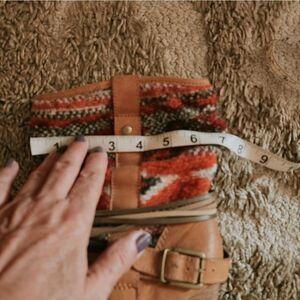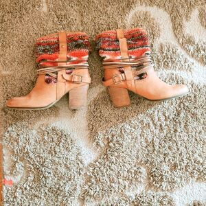 Steve Madden Tolteca cognac leather and southwestern , aztec print fabric mid-calf boots with multicolored leather ankle straps , brass buckled ankle belt, stacked 3" heels, round toe, pull-on style.