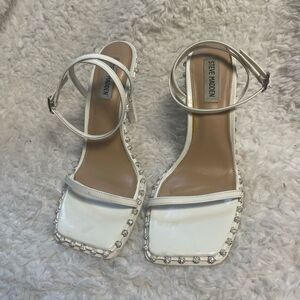 Steve Madden synthetic White patent Ankle Strap heels Rhinestones accents SZ8.5M square toe rubber. Pre owned in good used condition one stone is missing on the back of each sandals see all pictures any questions please message.